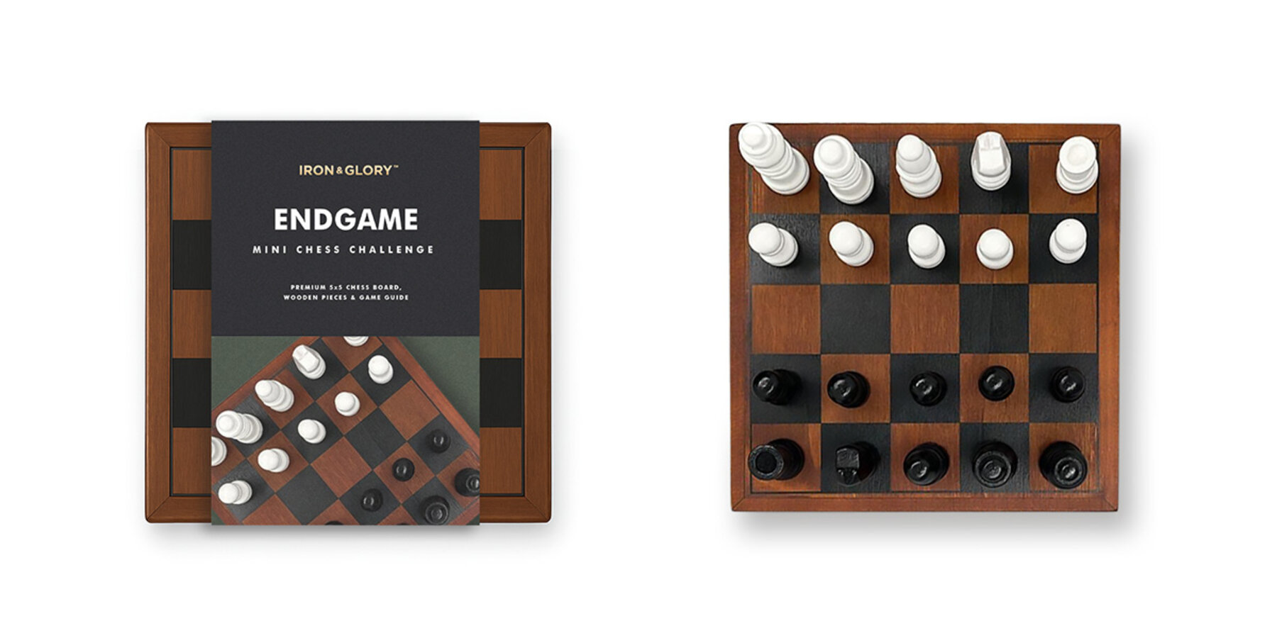 Iron & Glory Trä 5x5 Minischack Deluxe brädspel i trä. Innehåller 20 träbitar. Instruktionsbok med spelregler. Allt i en design, förvaringslådan är spelbrädet. Den sista delen av ett schackparti kallas slutspelet. Det är den fas då de flesta av pjäserna har bytts ut, och de återstående pjäserna, särskilt kungen, blir mer aktiva för att uppnå en vinst. Starka slutspelsspelare är bättre rustade för att omvandla små fördelar och rädda dåliga positioner. Finslipa ditt spel med Minichess, som spelas med vanliga schackpjäser och standardregler, men på ett mindre 5x5-bräde. Detta leder till förenklade positioner och ett större fokus på strategiska mål. En idé av Luckies of London gjord av Suck UK