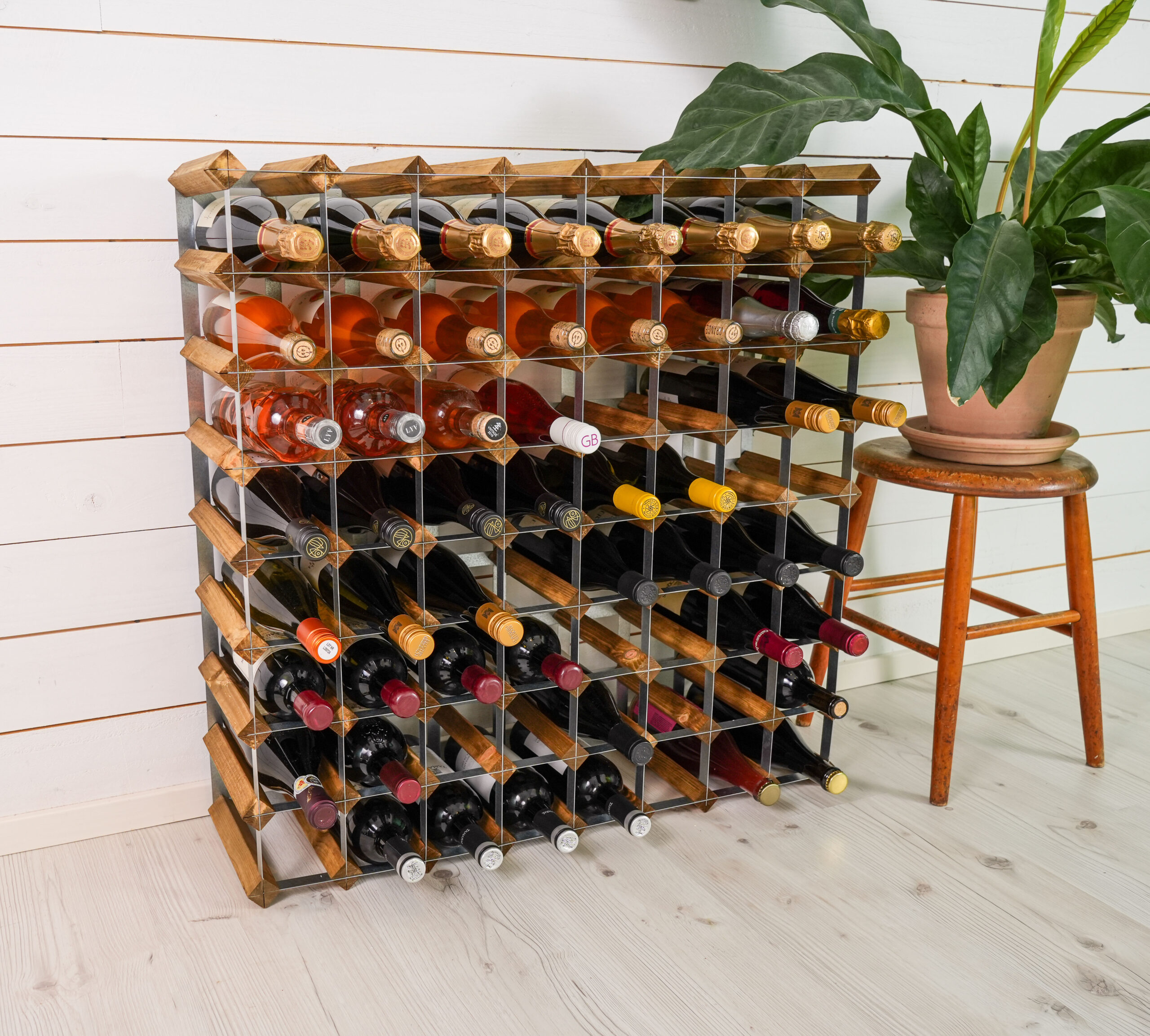 Påbyggnadsbart vinställ för 72 flaskor. Levereras omonterat. Stabil konstruktion och tillverkad av svenskt trä.