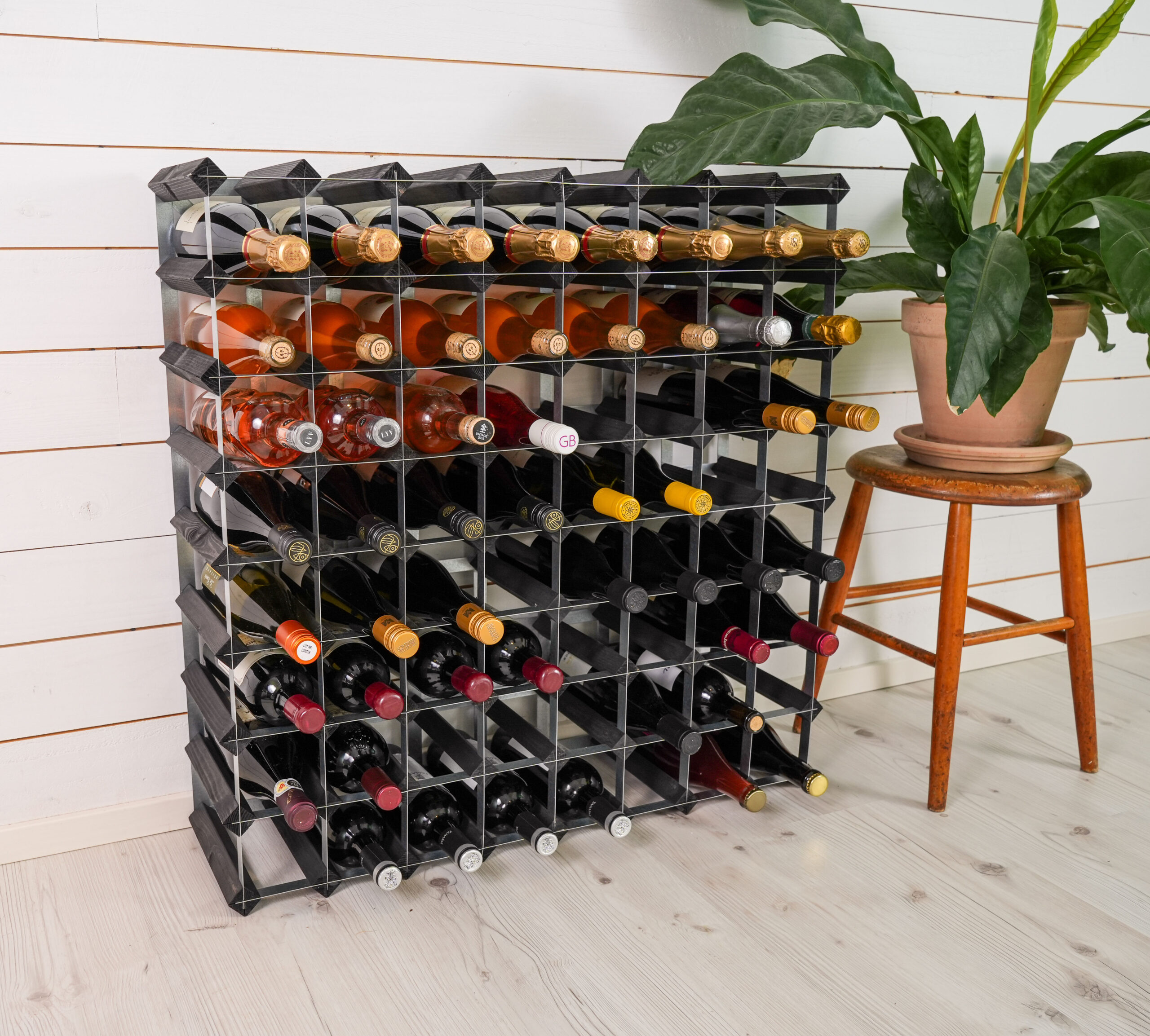 Påbyggnadsbart vinställ för 72 flaskor. Levereras omonterat. Stabil konstruktion och tillverkad av svenskt trä.
